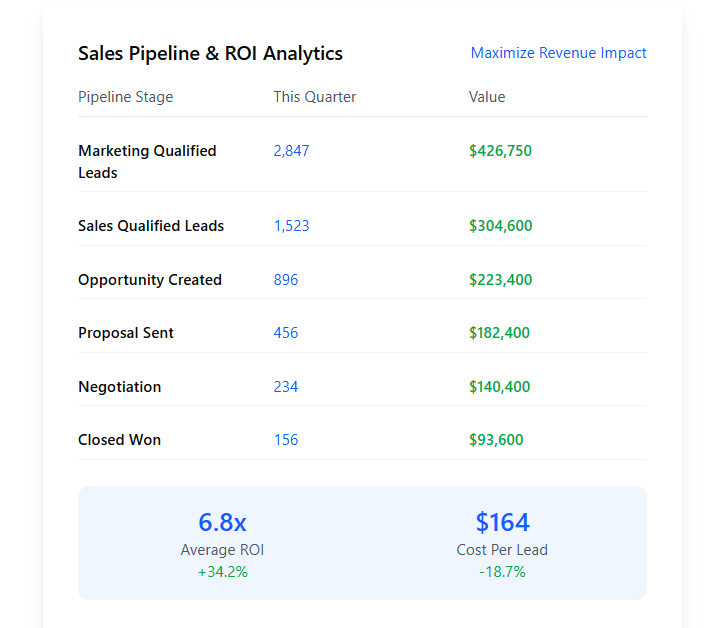Transform your lead generation into a predictable revenue engine. Our comprehensive approach not only generates leads but tracks them through your entire sales pipeline, providing clear visibility into ROI and helping you make data-driven decisions that accelerate business growth.